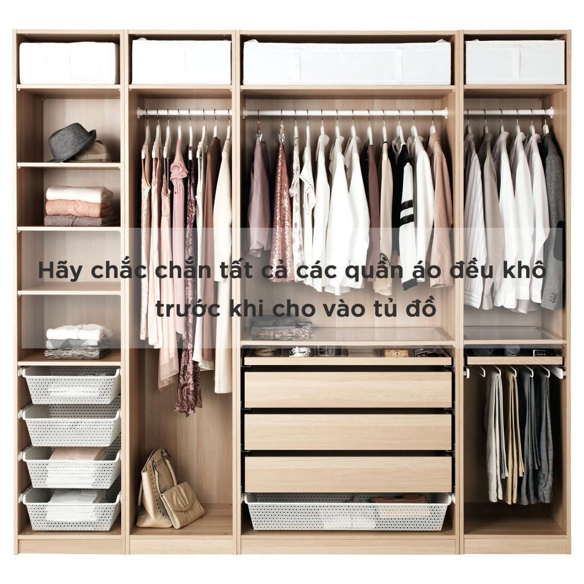 Sau khi giặt và phơi, chúng ta nên kiểm tra chắc chắn tất cả đã được phơi khô hoàn toàn trước khi gấp cho vào tủ bởi chỉ một chiếc áo mỏng còn ẩm ướt là đủ để cả tủ quần áo của bạn có mùi ẩm mốc khó chịu. Đối với những loại quần áo trái mùa cần cất đi, bạn cho quần áo, chăn màn vào những túi nilong to sau đó cho vài viên chống ẩm vào để hạn chế ẩm mốc.