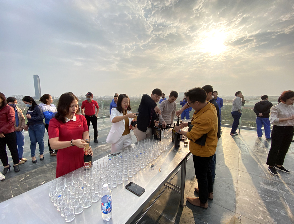 Bà Nguyễn Thị Thanh Hương cùng các cán bộ công ty mở sâm panh chúc mừng năm mới