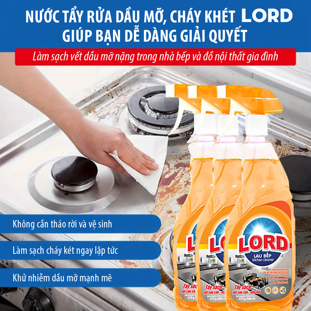 Với công thức làm sạch vượt trội, nước lau bếp Lord hương chanh dễ dàng đánh bay mảng bám lâu ngày, vết dầu mỡ cứng đầu, thức ăn cháy sém hay mùi hôi khó chịu.