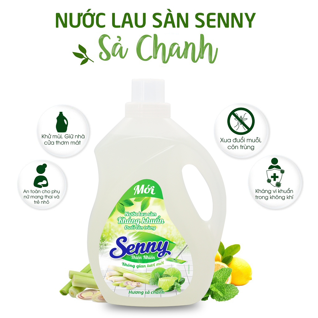 Nước lau sàn Senny thiên nhiên hương sả chanh kháng khuẩn, đuổi côn trùng hiệu quả. Sử dụng nước lau sàn Senny hương sả chanh mang đến cho bạn một sàn nhà sạch tự nhiên với hương thơm tươi mát. Nước lau sàn Senny thiên nhiên hương sả chanh diệt khuẩn, khử mùi sàn nhà, lau sàn nhà chống muỗi, kiến, gián và các loại côn trùng khác. Đặc biệt mang đến cho bạn một sàn nhà sạch tự nhiên với hương thơm tươi mát.