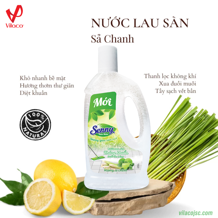 Với phương châm "An toàn cho sức khỏe, An tâm tiêu dùng", Vilaco đã cho ra đời dòng sản phẩm nước lau sàn hoàn toàn từ thảo mộc thiên nhiên. Nguyên liệu cốt yếu tồn tại trong nước lau sàn Senny sả chanh chính là chanh sả. Hòa quyện với nhau tạo nên dung dịch đậm đặc, nguyên chất giúp người dùng tiết kiệm thời gian, chi phí bảo vệ sức khỏe cho tất cả thành viên trong gia đình. Khác với dòng nước lau sàn công nghiệp, nước lau sàn Senny chiết xuất hoàn toàn từ tinh chất thảo mộc tự nhiên. Có khả năng làm sạch ngay cả sàn gỗ, sàn nhựa ...với những vết bẩn cứng đầu. Gia tăng tuổi thọ của gạch gỗ, nền xi măng. Xua đuổi, loại bỏ côn trùng gây hại trên sàn nhà cho không khí xung quanh thông thoáng, trong lành.