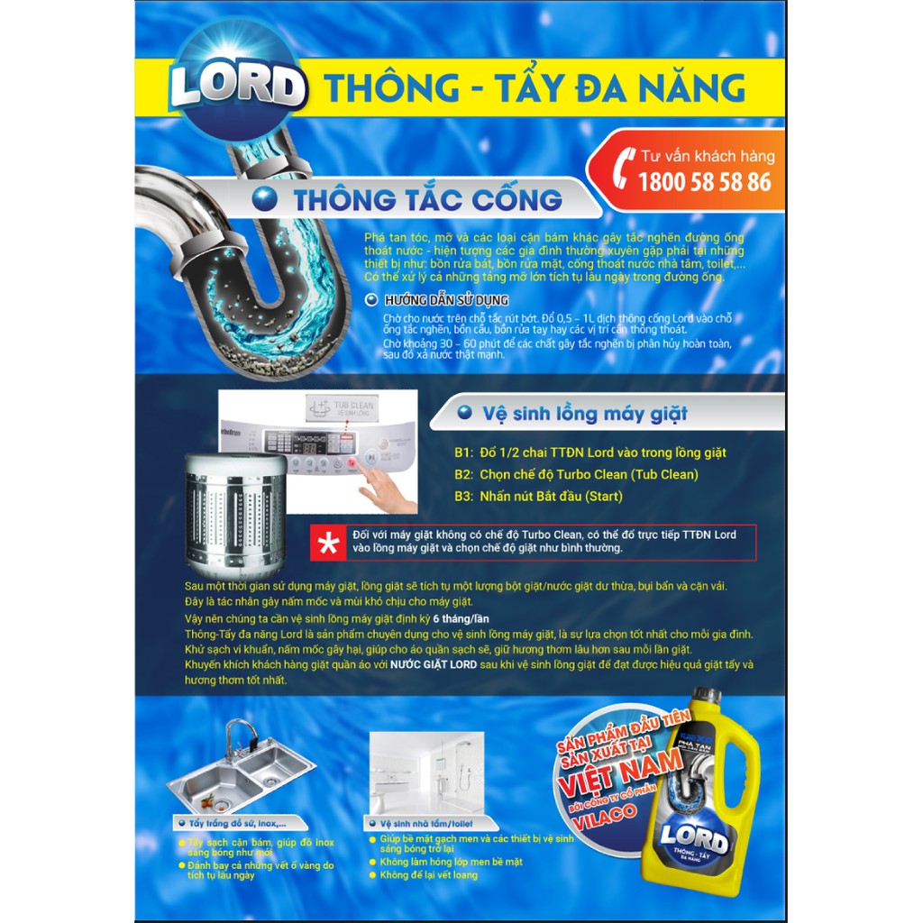 Thông tẩy đa năng Lord có khả năng đánh bay mọi mảng bám và vết ô đen của xà phòng bám vào thành máy một cách hiệu quả. Ngoài ra, sản phẩm còn có tác dụng khử mùi và đảm bảo quần áo sau khi giặt vẫn sạch sẽ, thơm mát mà không bị ám mùi.
