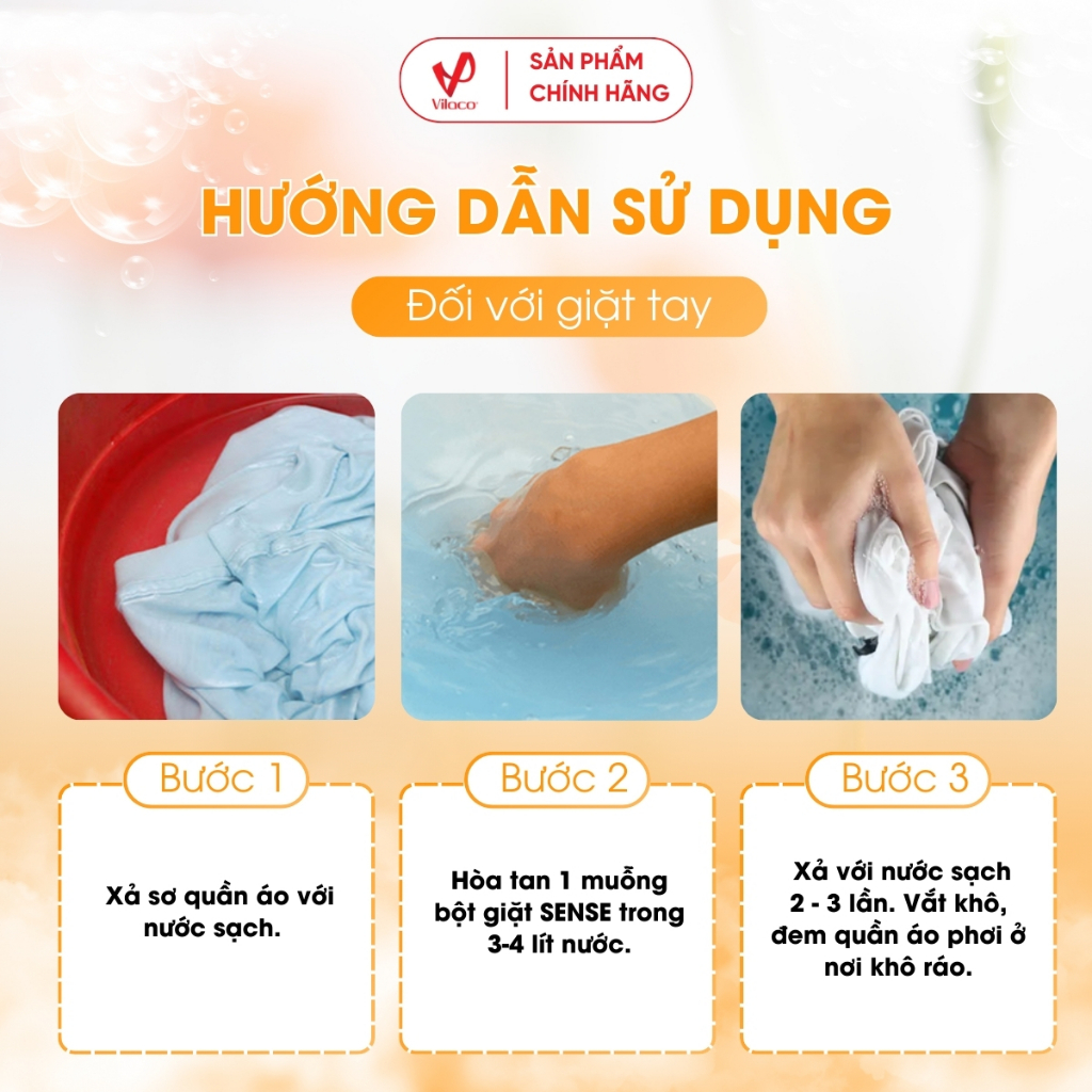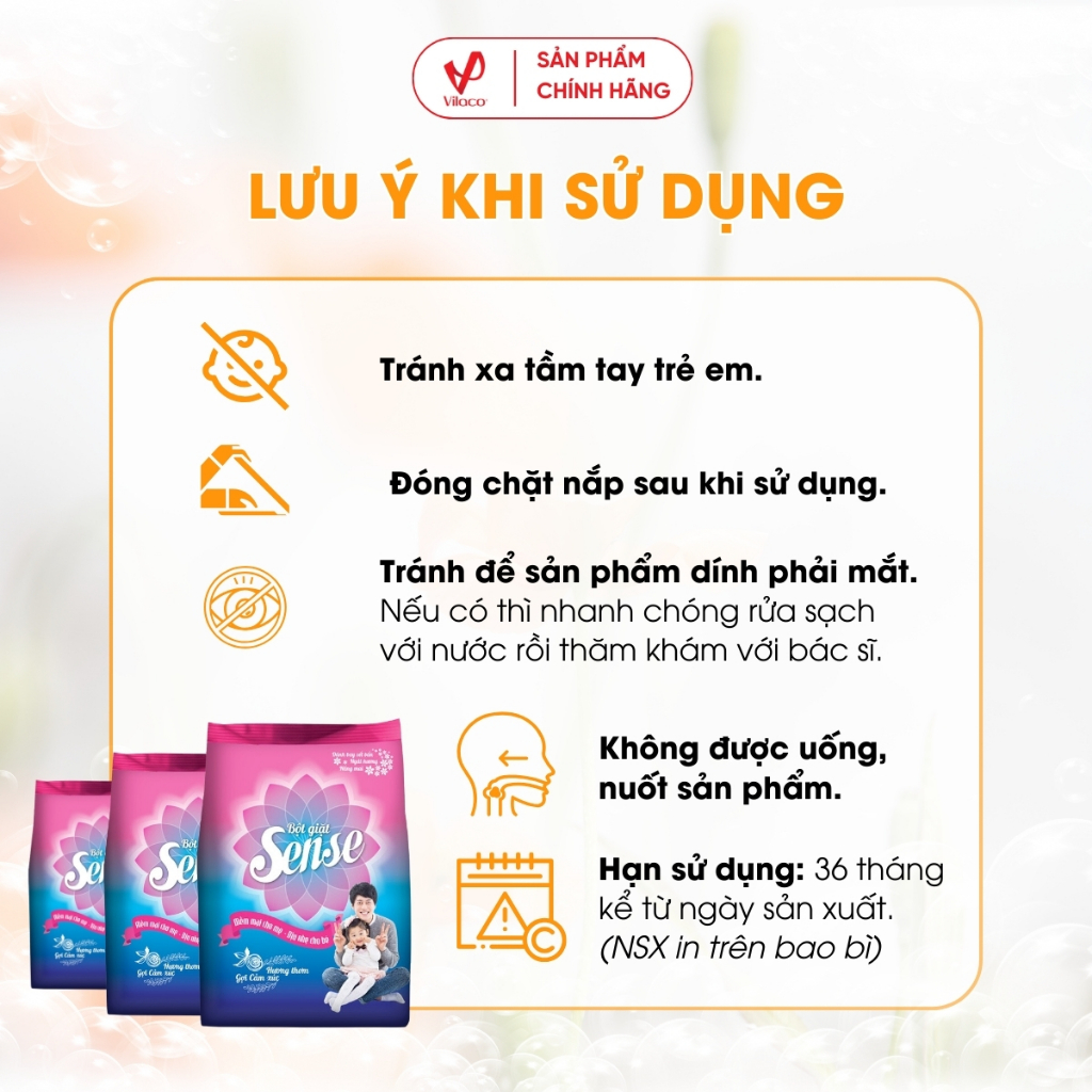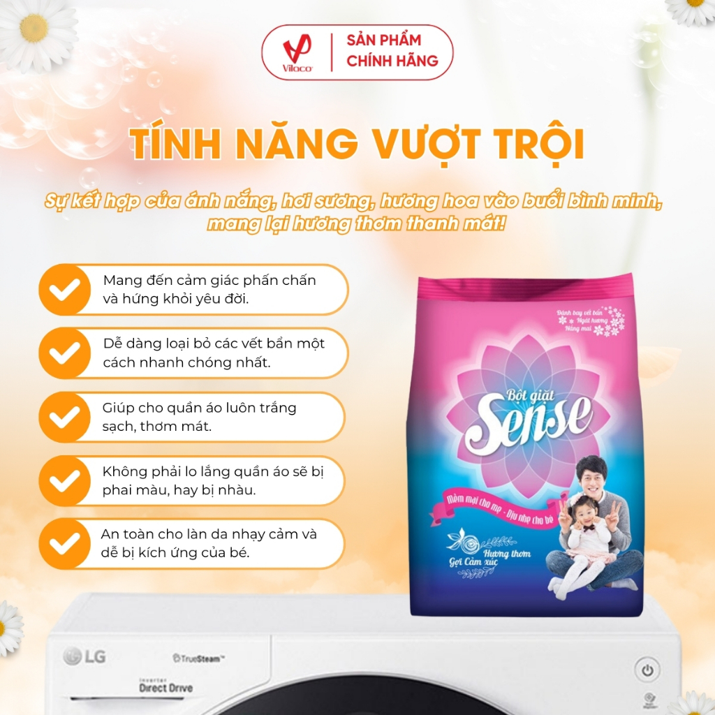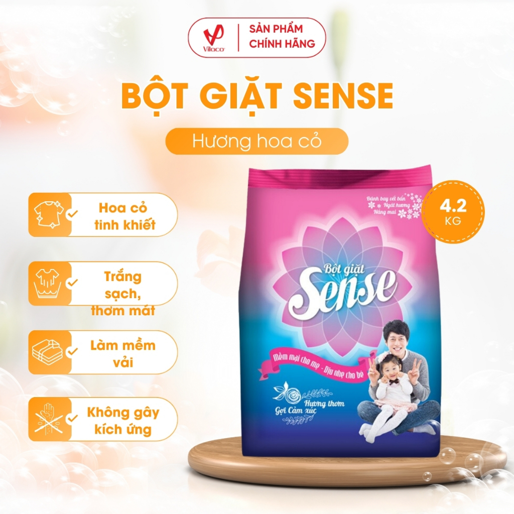 Sense sẽ giúp bạn dễ dàng loại bỏ các vết bẩn 1 cách nhanh nhất, giúp cho quần áo của bạn luôn trắng sạch, thơm mát với hương thơm tinh khiết. Sense khiến cho công việc giặt giũ của người phụ nữ Việt Nam nhẹ nhàng hơn, giúp cuộc sống gia đình thêm yêu thương chia sẻ. Với Sense, bạn sẽ không phải lo lắng quần áo sẽ bị phai màu, hay bị nhàu. Bột giặt Sense với thành phần đặc biệt giúp làm mềm từng sợi vải, ngăn hiện tượng khô cứng cho từng thớ vải. Quần áo sẽ mềm mại hơn sau khi phơi khô và ngay cả khi giặt tay hay giặt máy. Nhờ vậy quần áo khi được giặt với bột giặt Sense sẽ bền hơn các loại bột giặt thông thường.
