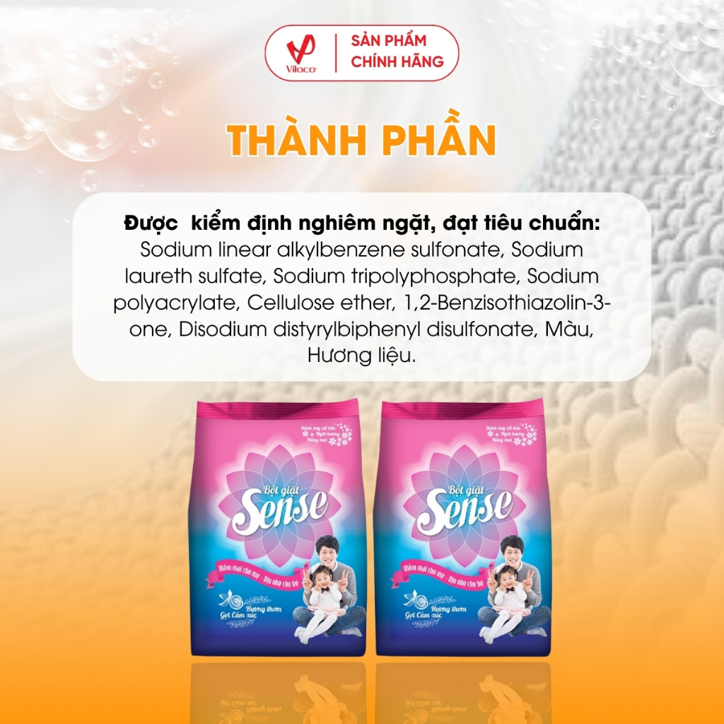 Bột Giặt Sense hương ngọt ngào sử dụng nguyên liệu chất lượng cao, đáp ứng các tiêu chuẩn quốc tế nghiêm ngặt về phân hủy sinh học và an toàn cho môi trường.