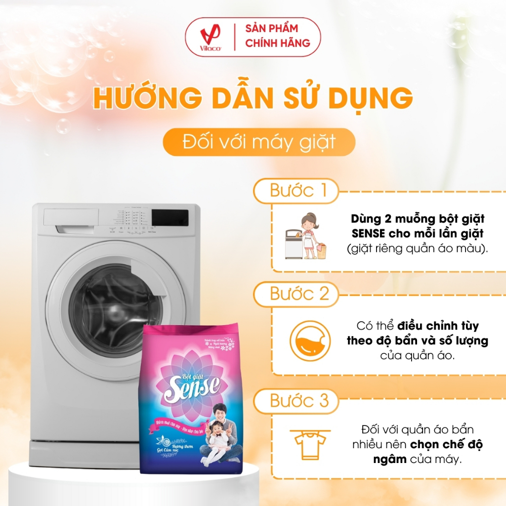 - Dùng 2 muỗng bột giặt SENSE cho mỗi lần giặt (giặt riêng quần áo màu). Có thể điều chỉnh tùy theo độ bẩn và số lượng của quần áo. Đối với quần áo bẩn nhiều nên chọn chế độ ngâm của máy.