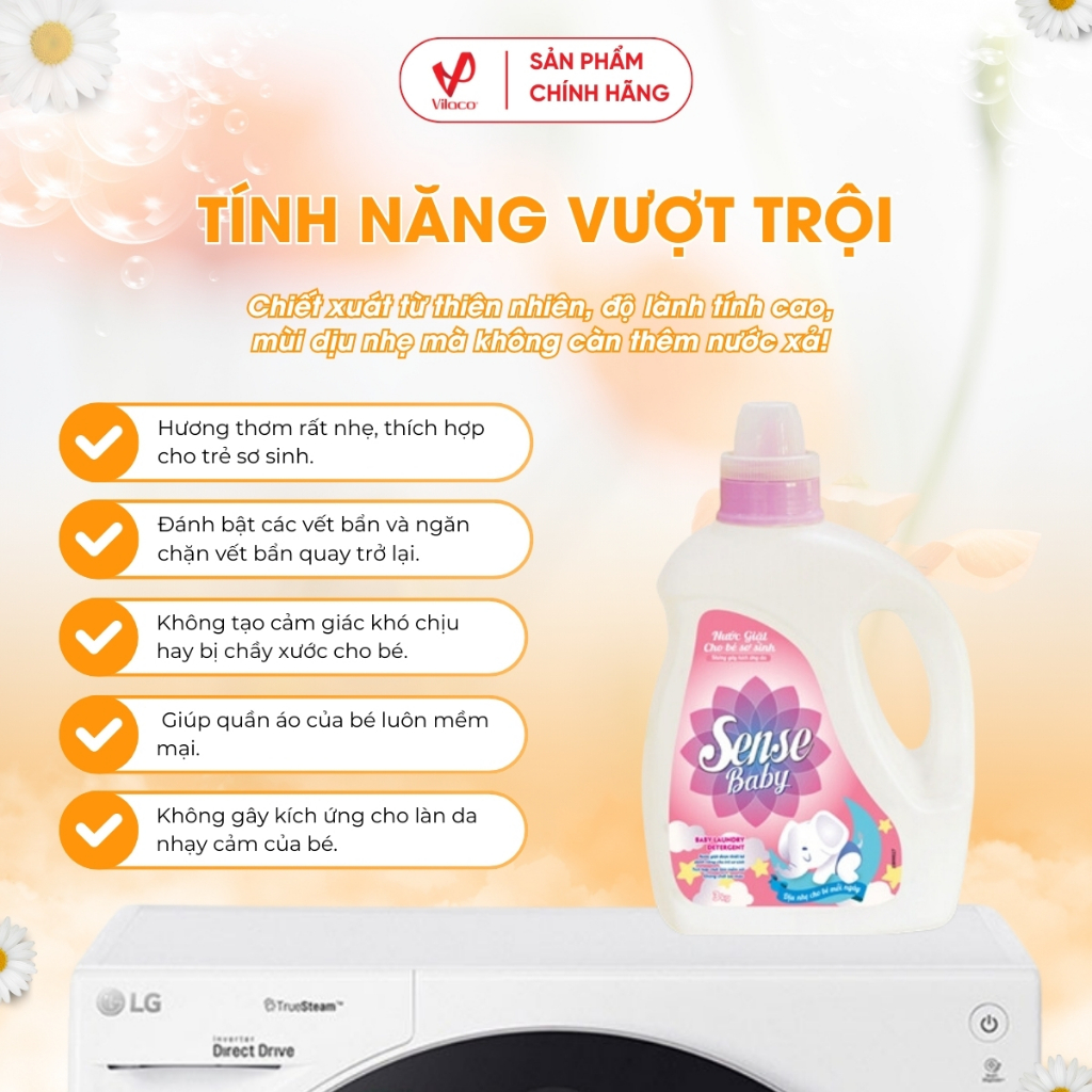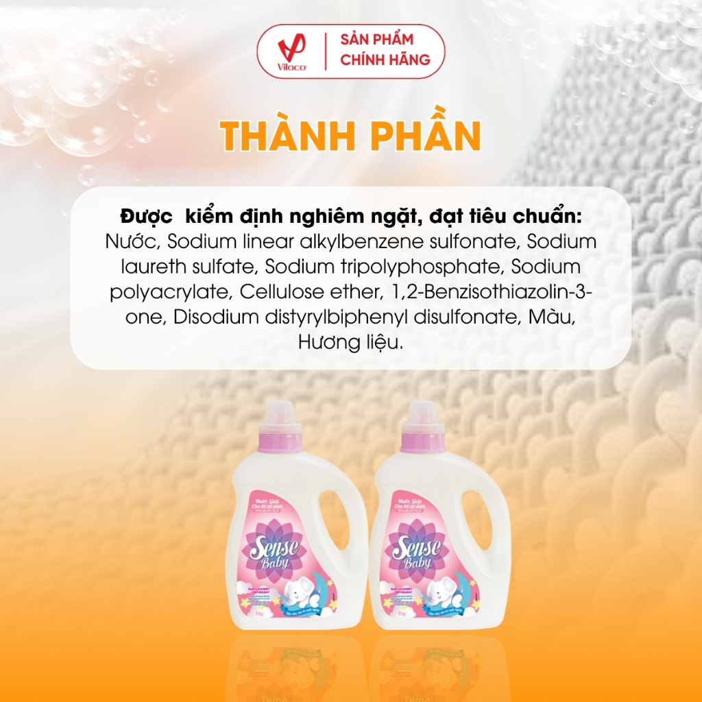 Thành phần trong nước giặt đều chiết xuất từ thiên nhiên, độ lành tính cao, mùi dịu nhẹ mà không cần thêm nước xả. Bên cạnh đó, nước giặt Sense dành riêng cho bé 0-18 thang tuổi có độ pH trung tính giúp quần áo của bé luôn mềm mại, không tạo cảm giác khó chịu hay bị chầy xước cho bé, không làm hư hại đến quần áo của bé.