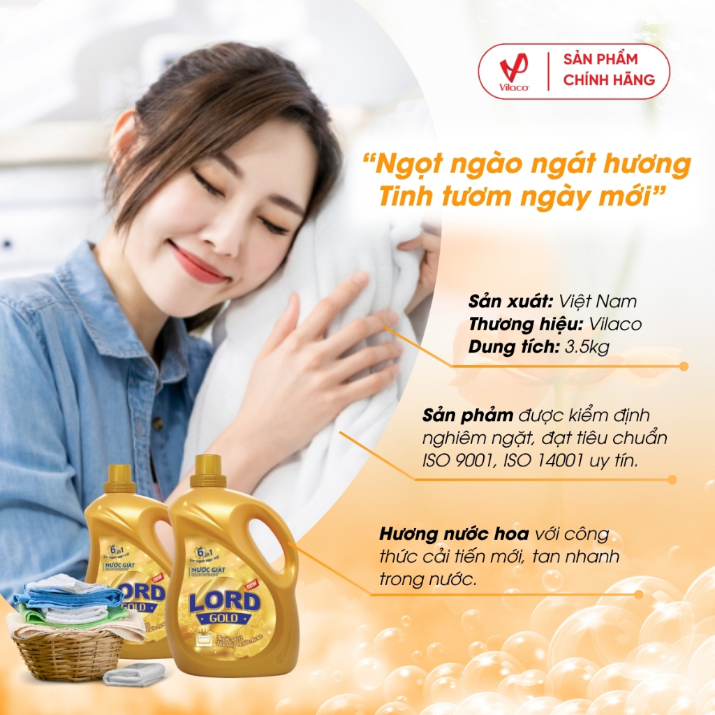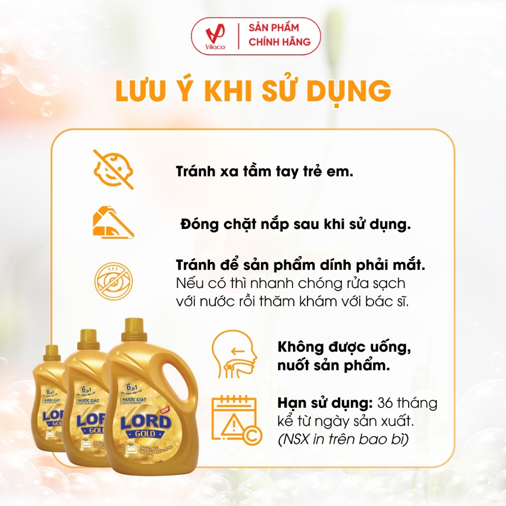 Nước giặt hương nước hoa Lord Gold Sản phẩm được quản lý bằng hệ thống quản lý chất lượng đạt tiêu chuẩn ISO 9001:2015. Với công thức hoàn toàn mới giúp các hạt tẩy được hoà tan dễ dàng trong nước, vừa mang lại sự tiện lợi cho người sử dụng, vừa đánh tan mọi vết bẩn, diệt mọi vi khuẩn, cho quần áo trắng sạch như mới.