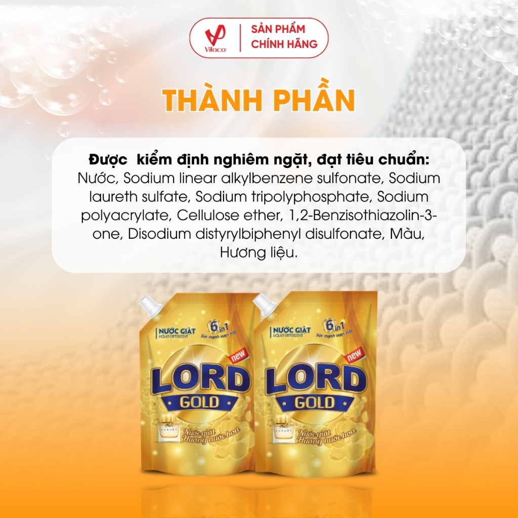 Nước giặt cao cấp Lord Gold dạng túi 2.1 kg tập trung vào nhóm các khách hàng có nhu cầu cao hơn với một số đặc tính của nước giặt như mùi hương và độ lưu hương. Ở nước giặt thông thường hầu hết các hương thơm có trong sản phẩm đều là hoá chất tạo mùi công nghiệp do vậy khi sử dụng trong quá trình phơi khô đối với quần áo các mùi hương sẽ rất dễ bị biến đổi không còn nồng nàn như mùi thương gốc ban đầu. Nhưng ngược lại ở Lord, tạo cho người dùng những trải nghiệm giống như các loại hương nước hoa đắt tiền.