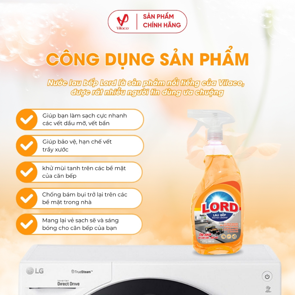 - Nước lau bếp Lord có thể sử dụng cho mọi bề mặt, từ bề mặt gạch, men sứ, crôm, kính, đá mài, nhựa cho đến thép không gỉ và đồ gia dụng khác như lò vi ba và mặt ngoài tủ lạnh.