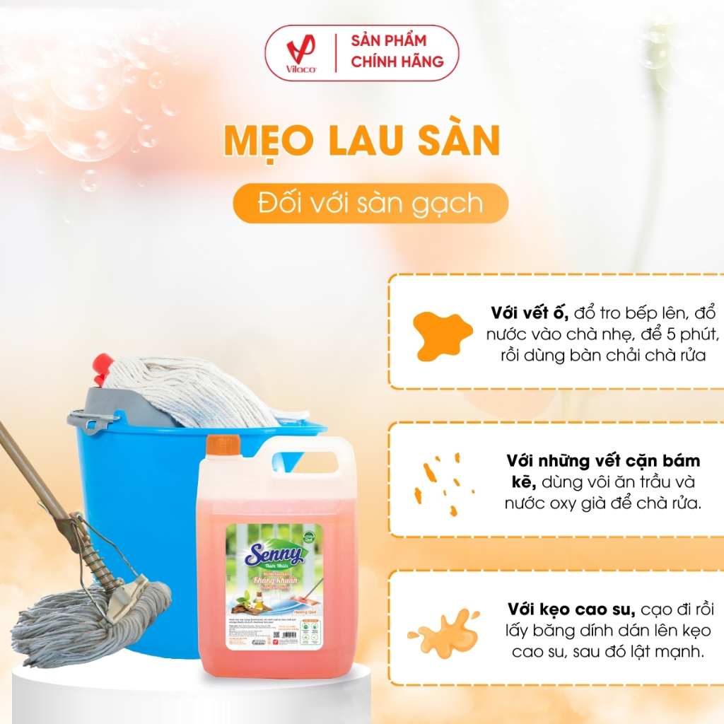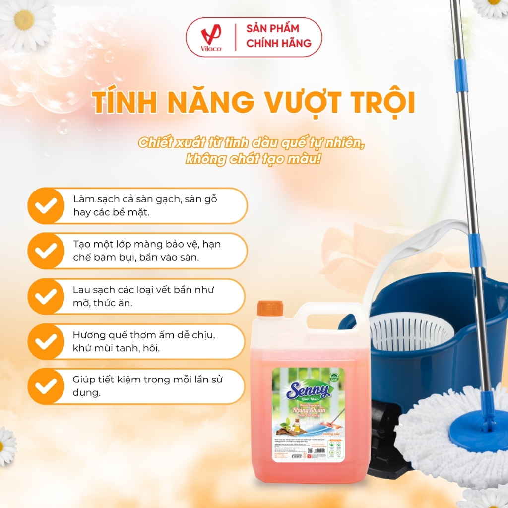 - Nước lau sàn Senny hương quế với công thức hoàn toàn mới, ​giúp làm sạch bóng sàn nhà, đánh sạch vết bẩn và bụi bám ở mọi ngóc ngách, bảo vệ sức khỏe cho cả gia đình.