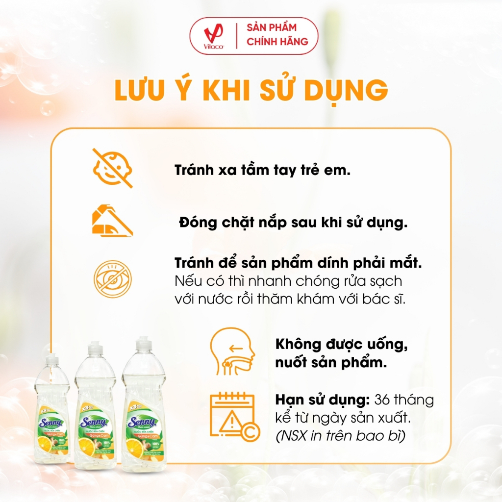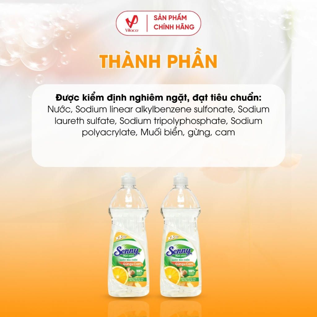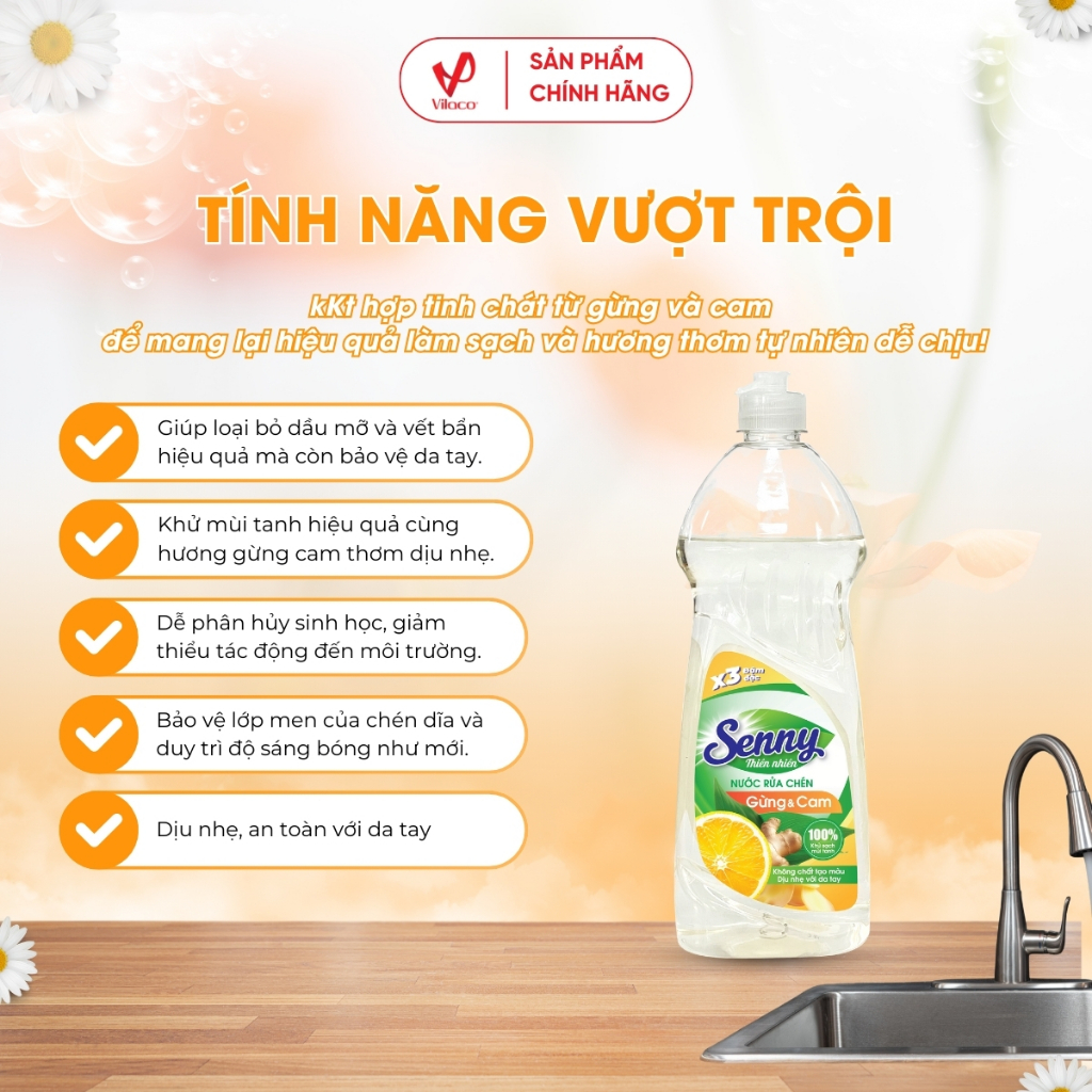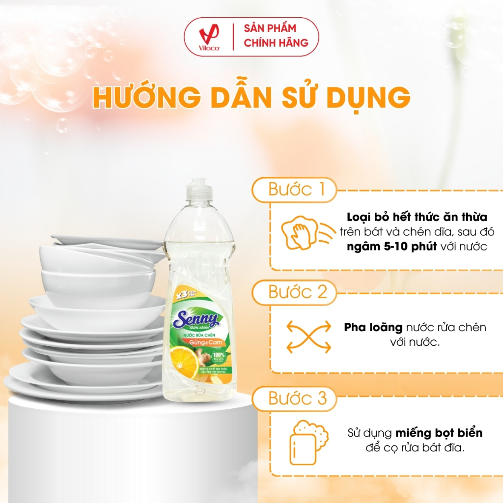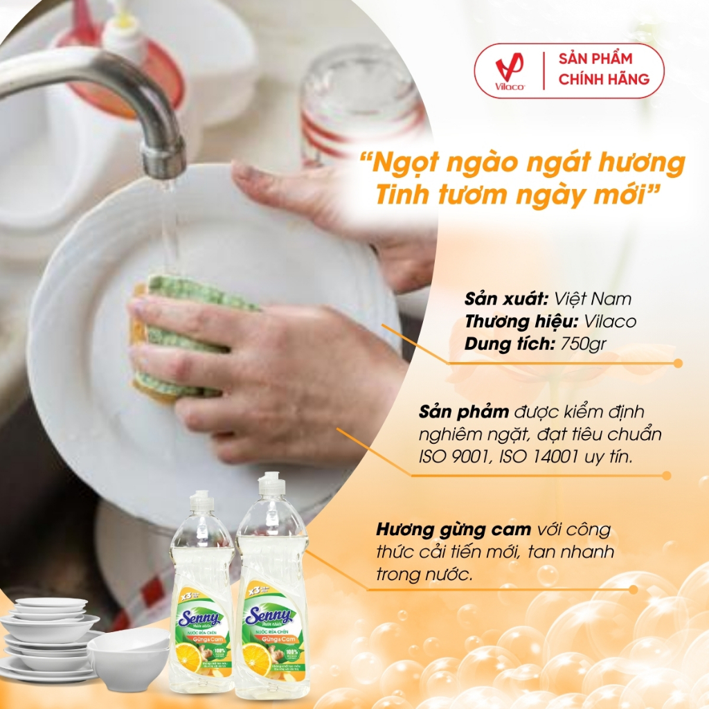 Nước rửa chén là sản phẩm giúp vệ sinh chén đĩa không thể thiếu trong mỗi gia đình hiện nay. Nước rửa chén Senny gừng & cam đậm đặc X3 là thương hiệu của công ty CP Vilaco được nhiều người ưa chuộng bởi độ lành tính và an toàn cho da tay. Khám phá ngay công nghệ làm sạch đột phá từ tinh chất thiên nhiên gừng & cam. Nước Rửa Chén Gừng Cam - Thân Thiện Với Môi Trường, An Toàn Cho Sức Khỏe.