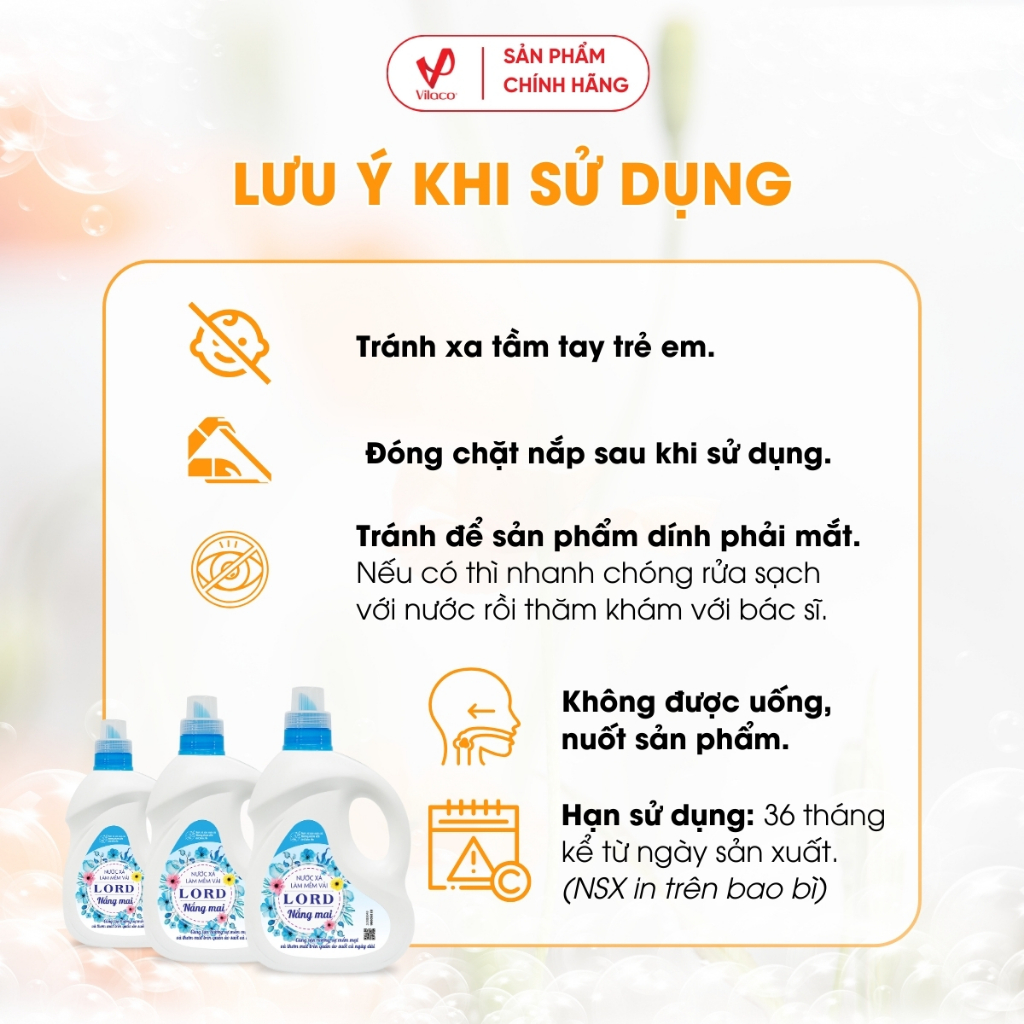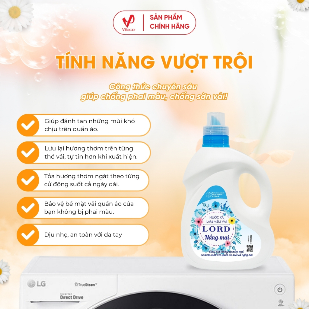 Nước xả làm mềm vải Lord sẽ bảo vệ bề mặt vải quần áo của bạn không bị phai màu, cháy nắng hay thô cứng sau khi phơi. Đặc biệt, nước xả không gây kích ứng mẩn đỏ cho da, có thể sử dụng cho trẻ em và da nhạy cảm.
