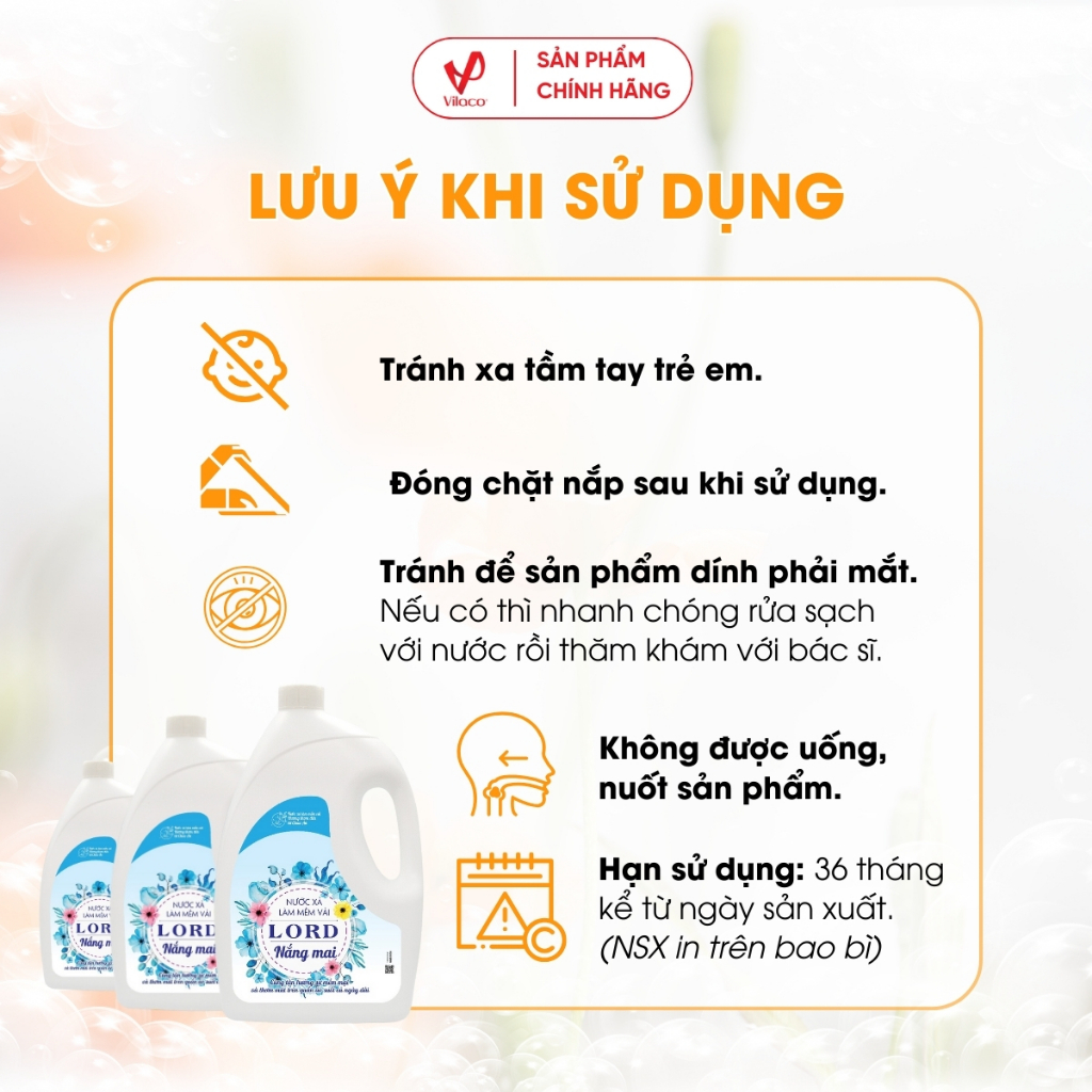 Uy tín và trách nhiệm mang đến những sản phẩm chất lượng tốt, an toàn với con người là những mục tiêu phát triển bền vững của Vilaco. Vì vậy, nước xả làm mềm vải Lord hương nắng mai 3kg trải qua nhiều kiểm nghiệm khắt khe về chất lượng và sự an toàn mới đưa ra thị trường.