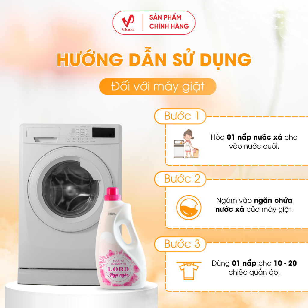• Hòa 01 nắp nước xả Lord cho vào nước cuối hoặc ngâm vào ngăn chứa nước xả của máy giặt.