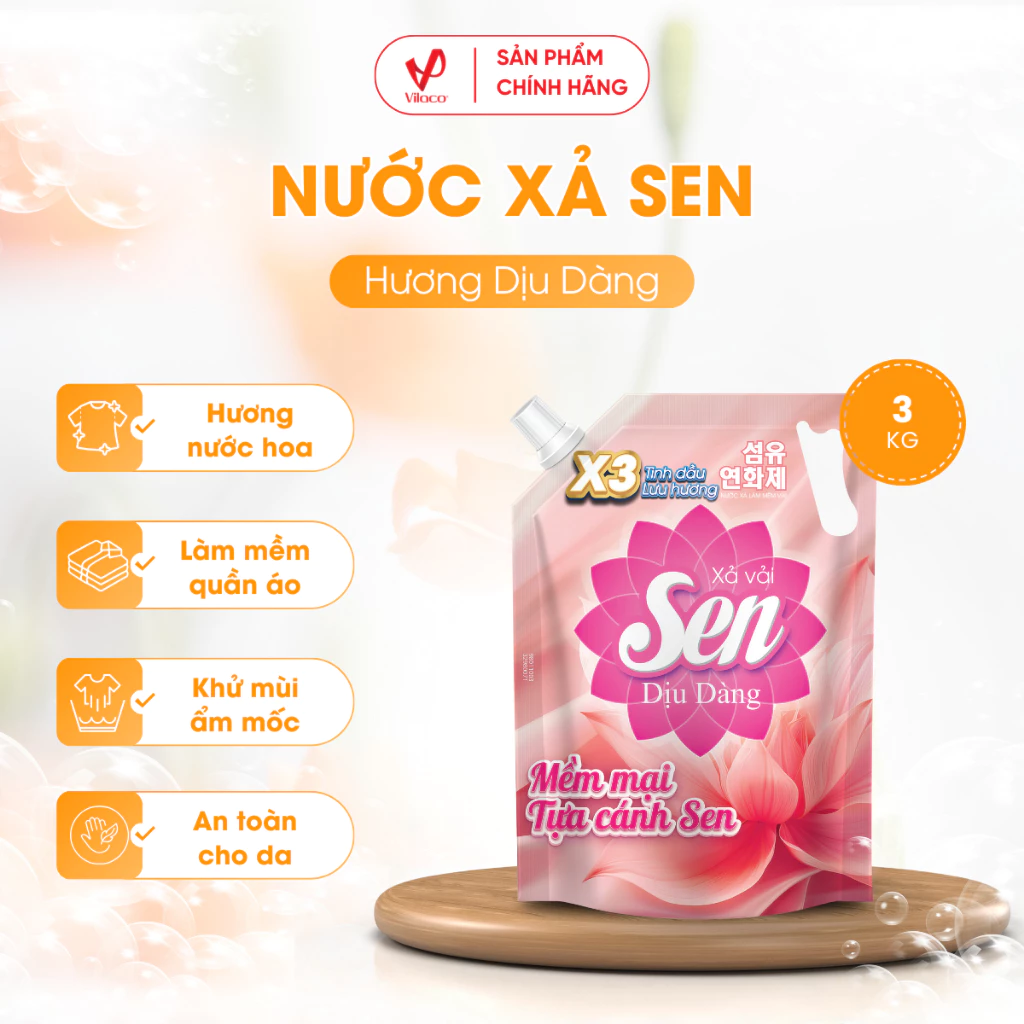 Nước Xả Làm Mềm Vải Sen Dịu Dàng hương nước hoa dịu nhẹ thơm lâu khử mùi ẩm mốc an toàn cho da. Với dung tích 3kg, sản phẩm vừa tiết kiệm vừa đáp ứng nhu cầu sử dụng lâu dài.