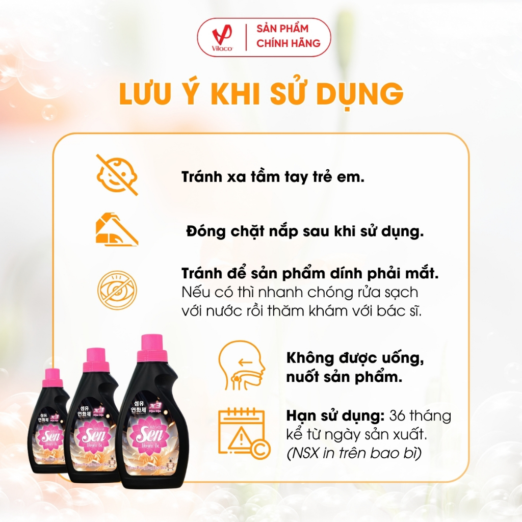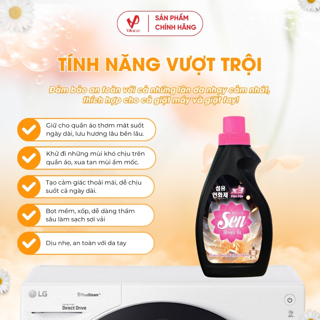 Bên cạnh đó, những thành phần của nước xả cao cấp Sen Huyền Bí đều được nghiên cứu và chọn lọc kỹ lưỡng kết hợp cùng cơ chế thẩm thấu nhanh vào từng sợi vải, đảm bảo an toàn với cả những làn da nhạy cảm nhất và giữ cho quần áo thơm mát suốt ngày dài. Ngoài việc lưu hương lâu bền lâu, nước xả vải Sen còn giúp khử đi những mùi khó chịu trên quần áo, xua tan mùi ẩm mốc vào những ngày mưa. Sản phẩm thích hợp cho cả giặt máy và giặt tay.