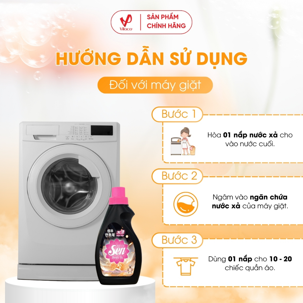 • Hòa 01 nắp nước xả cho vào nước cuối hoặc ngâm vào ngăn chứa nước xả của máy giặt.