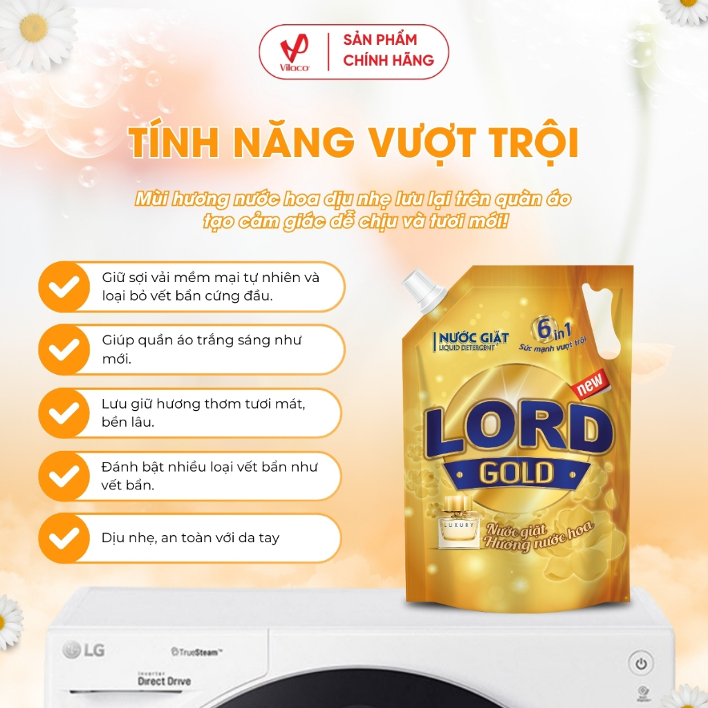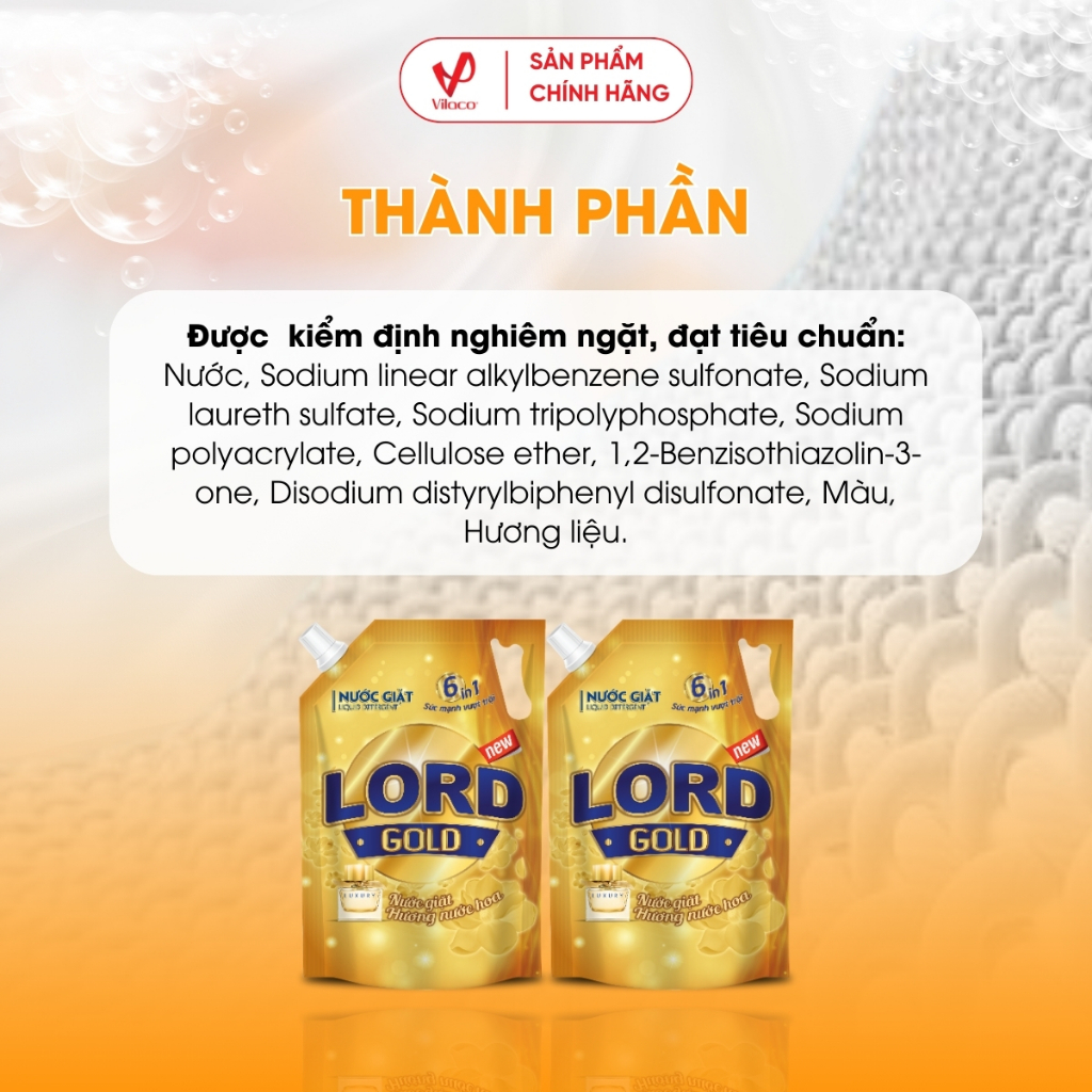 Nước giặt hương nước hoa Lord Gold Sản phẩm được quản lý bằng hệ thống quản lý chất lượng đạt tiêu chuẩn ISO 9001:2015. Với công thức hoàn toàn mới giúp các hạt tẩy được hoà tan dễ dàng trong nước, vừa mang lại sự tiện lợi cho người sử dụng, vừa đánh tan mọi vết bẩn, diệt mọi vi khuẩn, cho quần áo trắng sạch như mới.